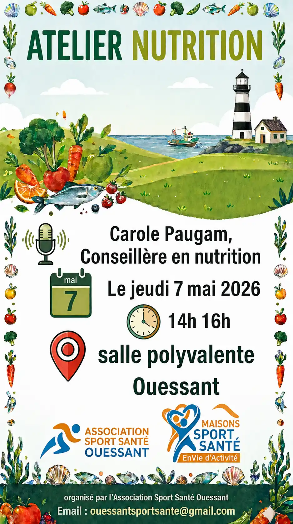 L’association organise un atelier nutrition animé par Carole Paugam, conseillère en nutrition, le jeudi 7 mai 2026 de 14h à 16h, à la salle polyvalente d’Ouessant.